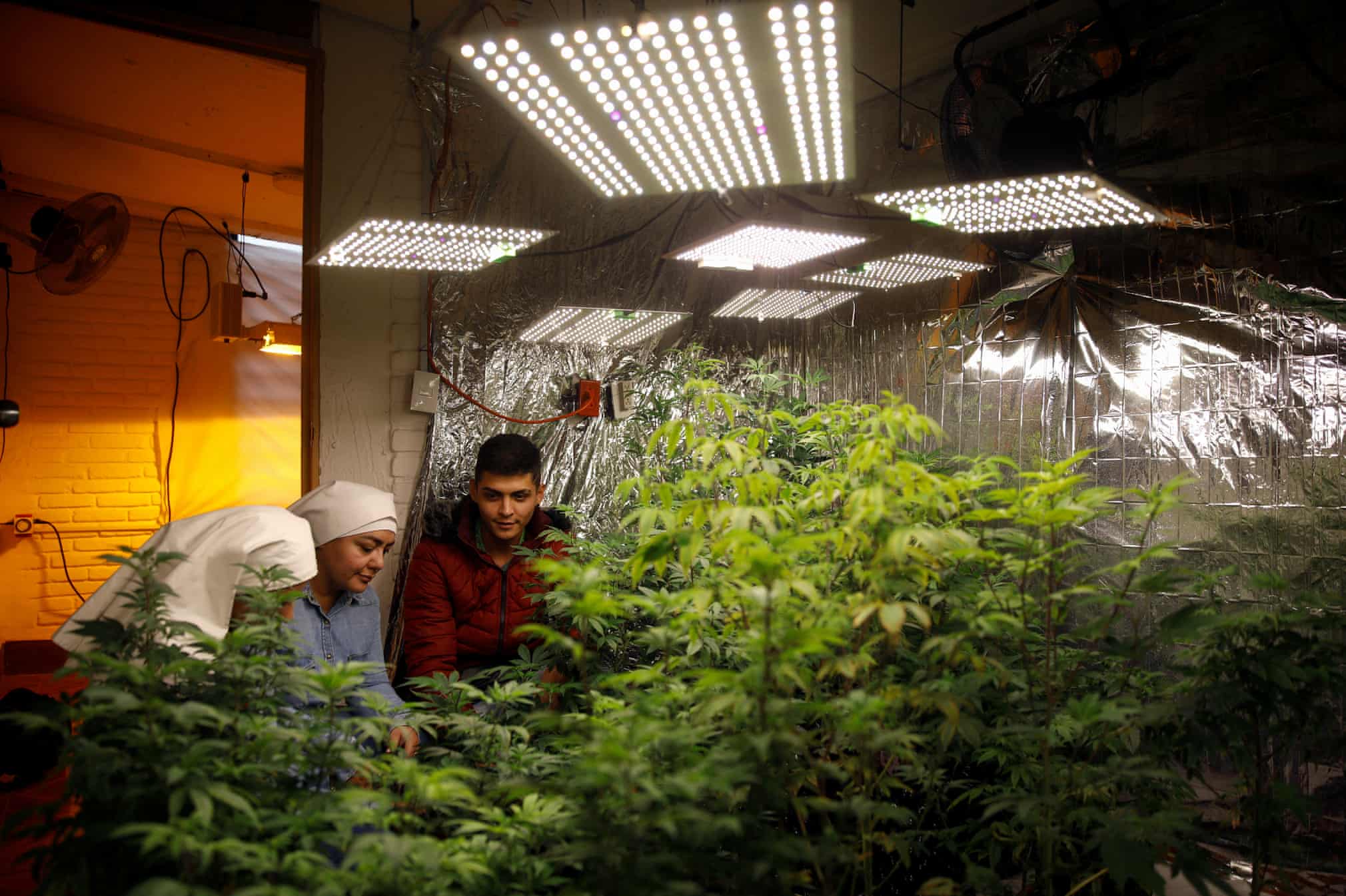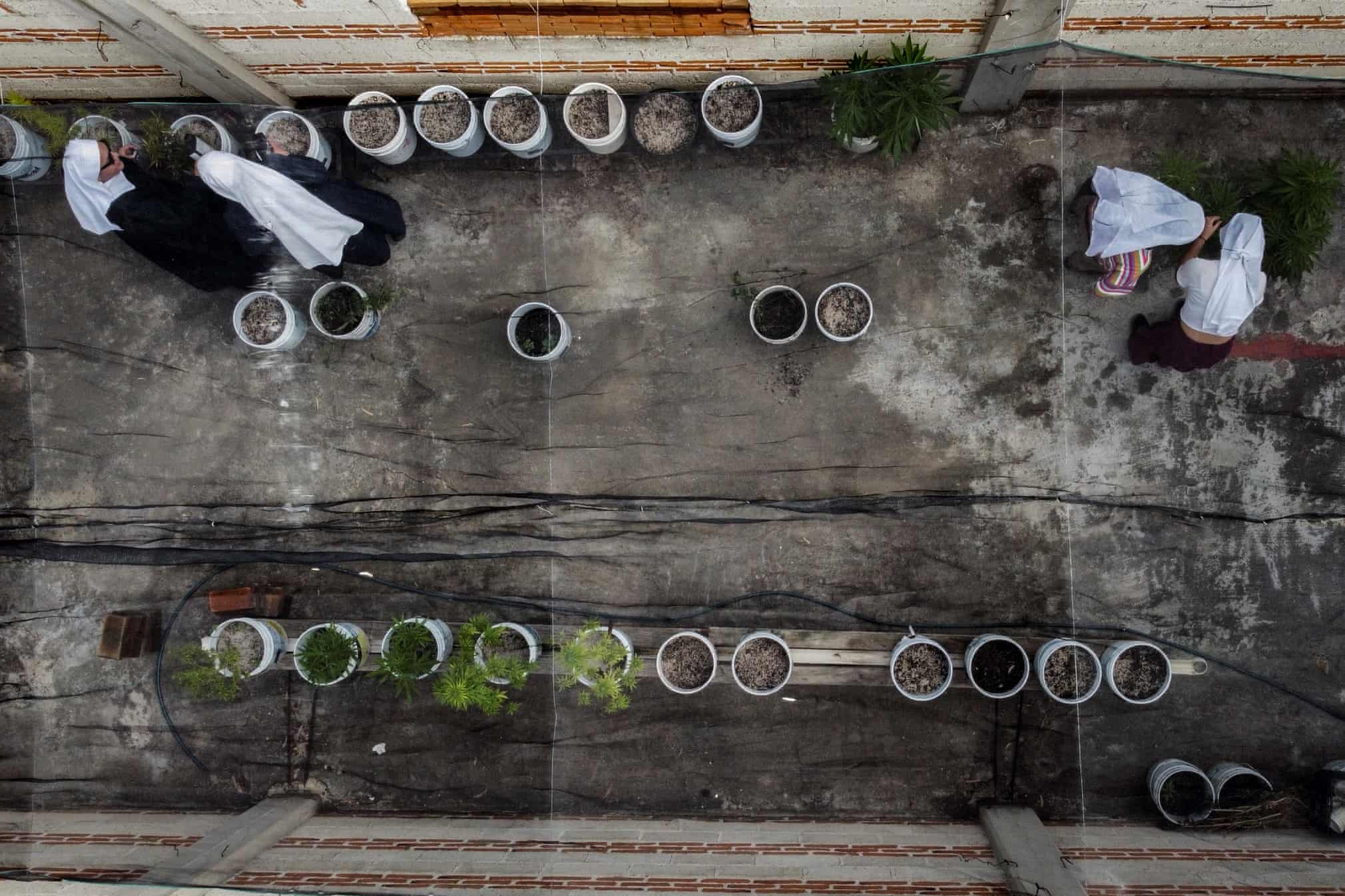 Članovi Sestara iz doline i Alehli Paz, 34, hemičar i istraživač marihuane koji radi s grupom, brinu o biljkama kanabisa na krovu na svojoj farmi na periferiji sela u centralnom Meksiku.