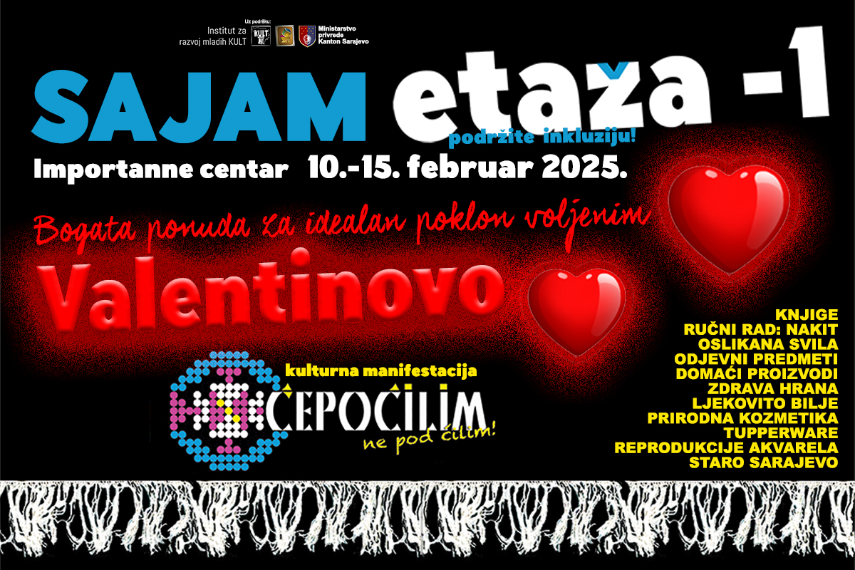 Za period 10.02. do 15.02.2025. u Importanne centru na etaži -1 (Kod Konzuma) Udruženje “Green Art” organizira kulturnu manifestaciju “ČEPOĆILIM”. Tim povodom će upriličiti likovnu izložbu “11-godina uspjeha projekta “ČEPOĆILIM” pretočenog u plakate i umjetničku instalaciju mobilnog “ČEPOĆILIMA”. Sve je obogaćeno sajmom sa mnogim izlagačima, kreativcima i proizvođačima zdrave hrane. Od bogatog izbora knjiga, ručno izrađenog nakita, odjevnih predmeta, prirodne kozmetike do prirodnog meda,sokova te mnogo toga za jači imunološki sistem. Na jednom mjestu pripremili su dosada najveću ponudu pa vrijedi doći i pogledati. Usput pronađite i savršen poklon za Valentinovo! Čekamo vas u Importanne centru na etaži -1/Suteren uz 1h Besplatnog parkinga!